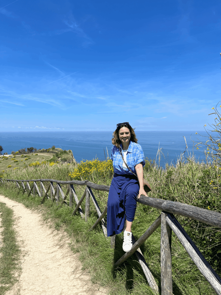 Ao longo do caminho, o visitante encontra mirantes naturais que revelam o azul intenso do mar Adriático e as falésias do Monte San Bartolo.